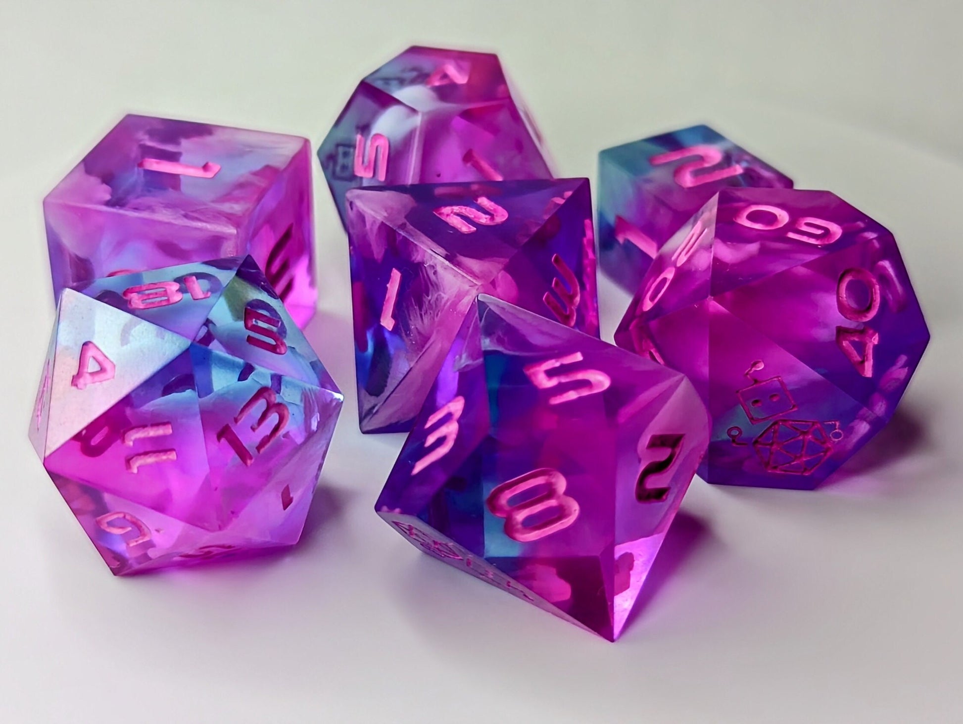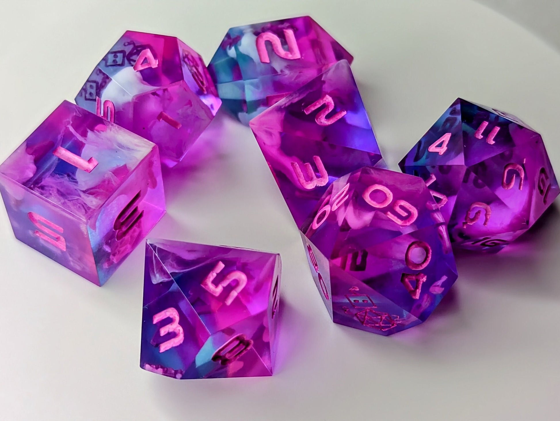 Dice Set Custom - Neon Sound of Silence Dice - Handmade resin dice for D&D and Roleplaying - Set of 7 polyhedral sharp edge dice