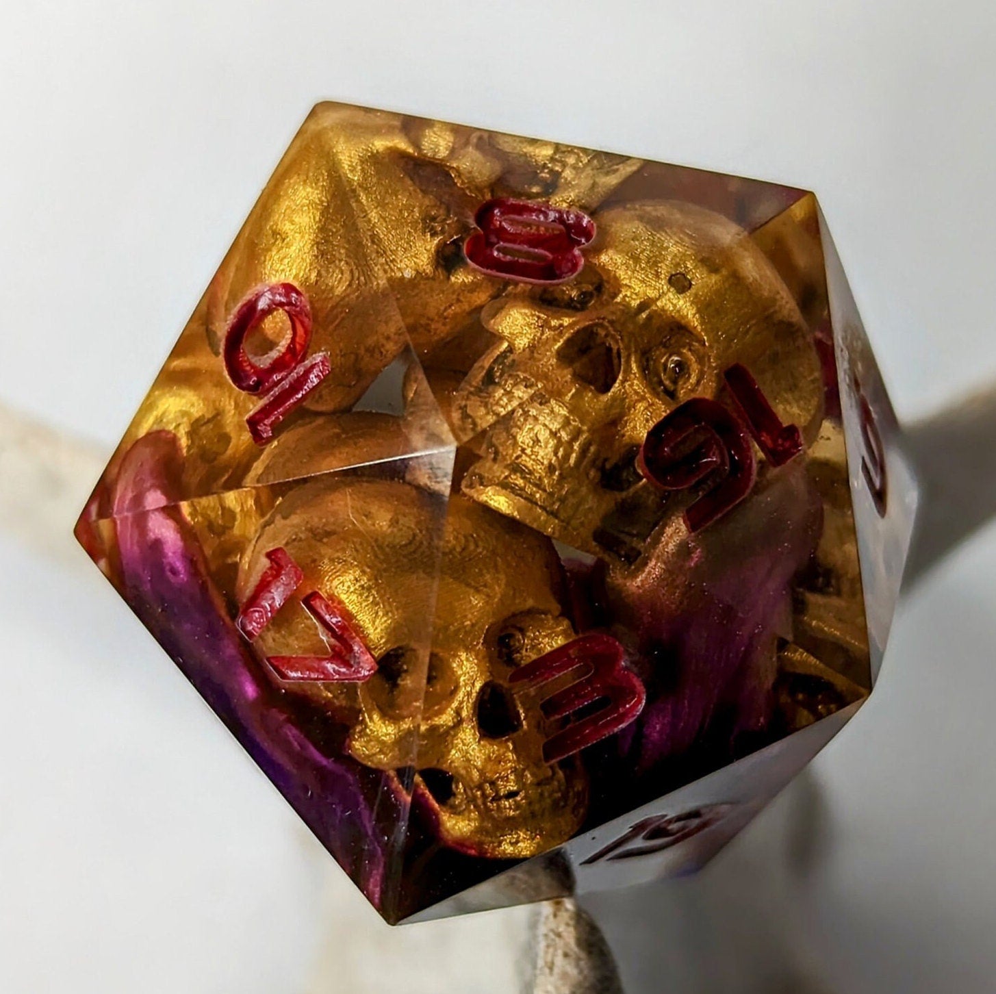 3D printed and hand painted skull inclusions inside dice.